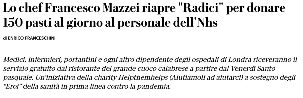 During the lockdown caused by COVID, whilst many were lamenting their losses, Francesco Mazzei rolled up his sleeves and thought of others. He used his restaurants Sartoria, Radici and Fiume and staff to provide free lunches to the personnel of hospitals in London, that is, doctors, nurses, porters, employees, cleaners and any other person working there. He also joined the initiative Help the Hungry organised by The Independent and provided free food for 300 homeless, unemployed and persons with disabilities.