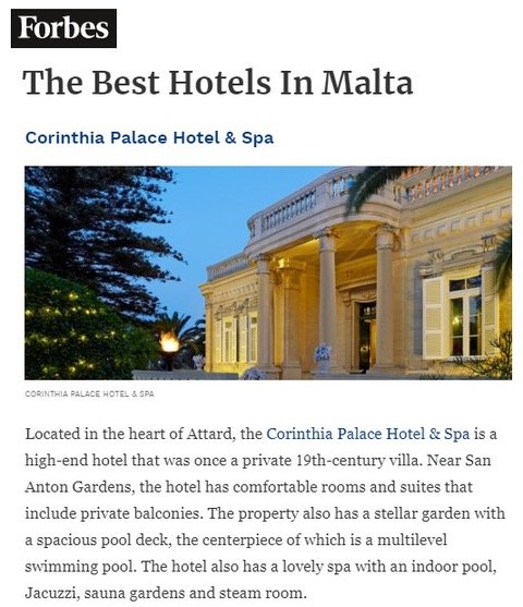 Once we are on the radars of journalists, we often get further mentions in round-ups. Corinthia Palace was recently included in guides to ‘The Best Hotels in Malta’ on The Independent’s website, Forbes.com and The Luxury Editor. Corinthia St Petersburg was included in a round up of ‘8 opulent hotels for a luxury stay in St Petersburg’ on The Telegraph’s website. The article was also published on Yahoo.com which has a potential online reach of millions of consumers each month. Corinthia Budapest has been included in two city guides to Budapest on the widely-read US website CNN (The Ultimate Wellness Guide to Budapest and 10 of the Best Restaurants in Budapest)