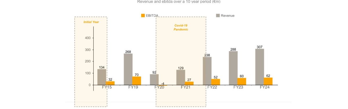 By an equal margin to revenue, the Group recorded an EBITDA of €62 million in FY24, notwithstanding cost pressures and operational investments in new operations.