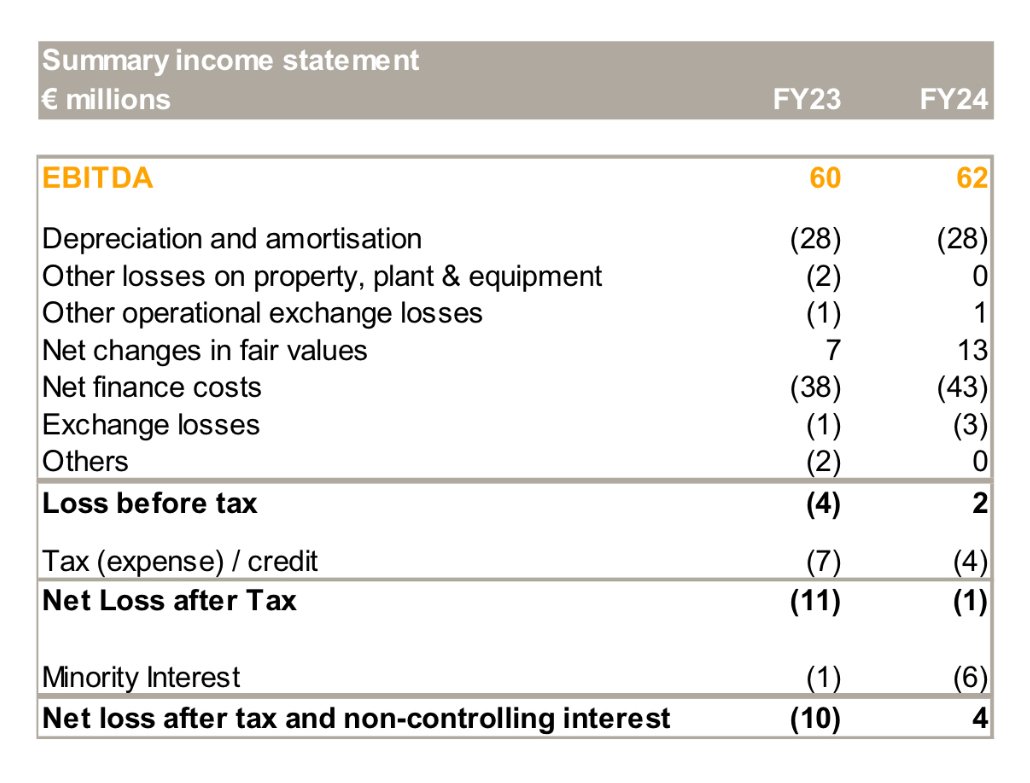 EBITDA in FY24 was mainly absorbed by depreciation, net finance costs and exchange differences.