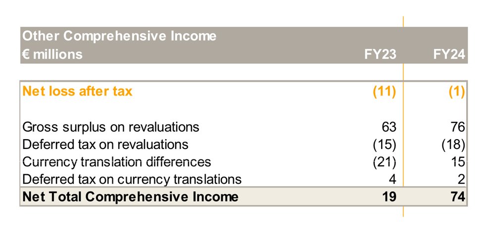 Changes in fair value for FY24 mainly relate to a net uplift in the assessed valuation of the Group’s investment property, namely: Tripoli Commercial Centre (+€3m), Corinthia Prague (+€2.6m), St Petersburg Commercial Centre (+€1m) and also to an impairment reversal on the Corinthia Hotel Tripoli (+€6.5m).