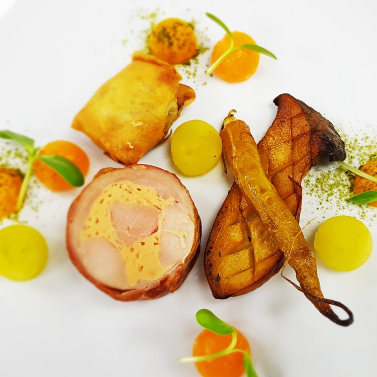 “For the parcel component I draw inspiration from our neighbours in North Africa. The legs are slowly braised in red wine and spiced with cinnamon, cumin, nutmeg, ginger, cardamom and turmeric. Once cool, we take the meat and season with honey and create small parcels (similar to a Moroccan pastille). The loin is boned and wrapped in lard and poached, we then lightly fry to crisp the fat on the outside that renders during cooking to keep the loin moist.”